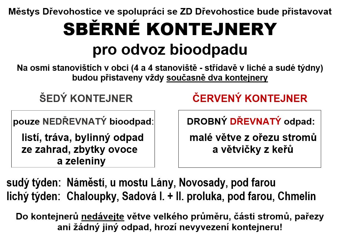 Vzhledem k tomu, že probíhají stavební práce na ulici Lesní a brání tak vhodnému umístění kontejneru na bioodpad, budou tyto kontejnery prozatím přemístěny